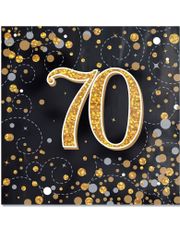 20 stk Gullfolierte servietter med "70th Birthday!" tekst, måler 33x33 cm brettet ut. Vi har også tallerkener, pappkrus, bestikk og mye annet du kan komplimentere med :)
