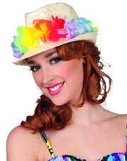 Hvit fedorahatt med stjerner og 60-tall i sølv pyntet over hele hatten og et svart bånd med 60-tall og stjerner i gull.