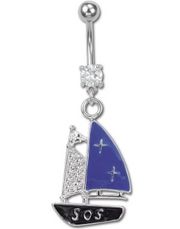 Søtt piercingsmykke til navlen. Smykket er formet som ensittende katt med rosa stener og en hvit sløyfe.
