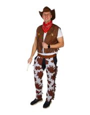Kostymet inkluderer en stilfull skorte med ku-mønster og brune bukser. Den blå skjorta gir en autentisk følelse, mens de brune buksene med frynsedetaljer sørger for at du ser ut som en ekte cowboy.