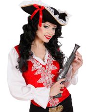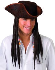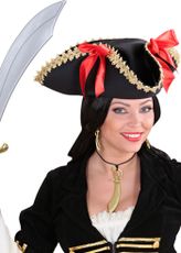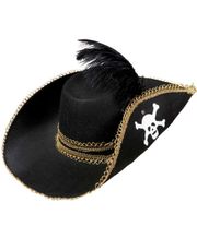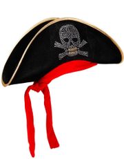 Svart sjørøverhatt for barn med gullkant og hvitt dødninghode foran. Hatten har strikk som går under haken. Du er ikke en skikkelig kaptein på skuta uten denne hatten. - Store bestillinger