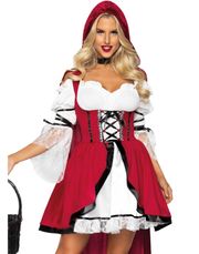 Kostymet har en vakker, dyp rød farge som fanger oppmerksomheten umiddelbart. Den elegante kappen med hette gir en mystisk og fortryllende look, perfekt for en kveld med eventyr. Den korte kjolen har et klassisk sort-hvitt snøreliv som fremhever figuren, mens de delikate blondekantene gir et snev av eleganse.