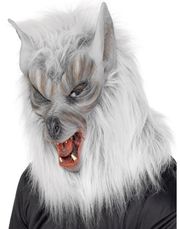 Svart og grå parykk med skinnskjegg som du kan bruke til varulv og andre karakterer. - Store bestillinger