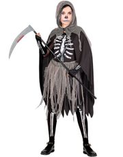 Tøft dødsengel barnekostyme bestående av lang drakt, hansker og maske med hette og lysende fadein-fadeout øyne.